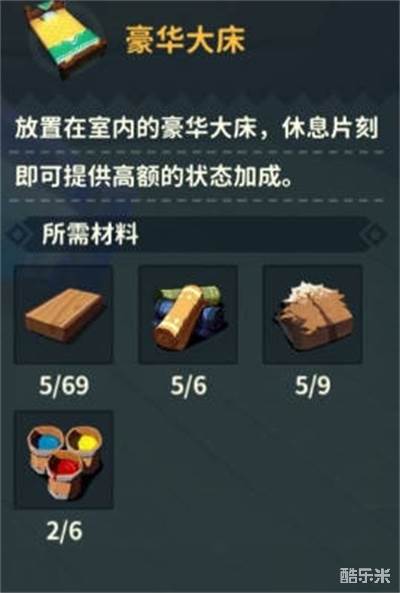 3:三级床豪华大床,皮是猛兽牧场获得的,木板69,布6个,9狐狸皮,6个染料;