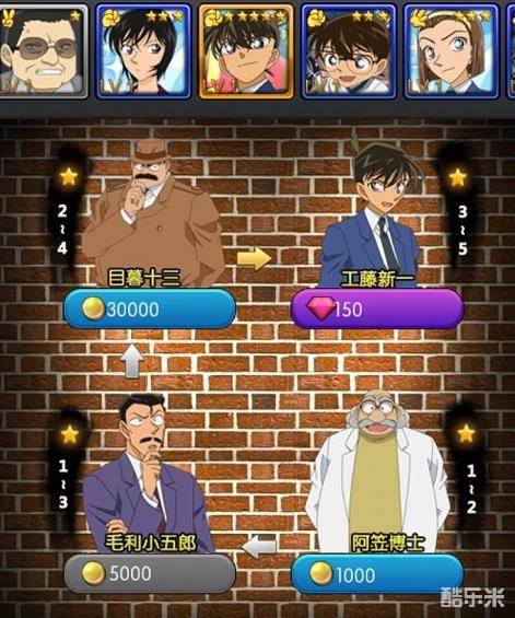 金币抽卡分为4档:阿笠博士、毛利小五郎、目暮十三、工藤新一