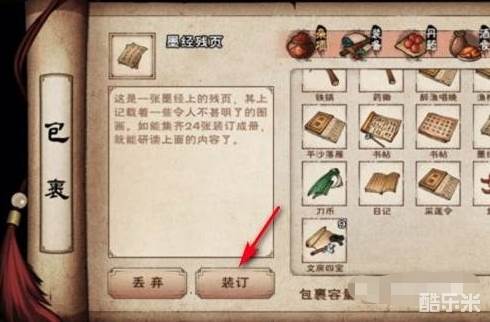 1、想要学习墨学,首先需要获得墨经,玩家需要获得24张墨经残页通过装订的方式获得墨经。