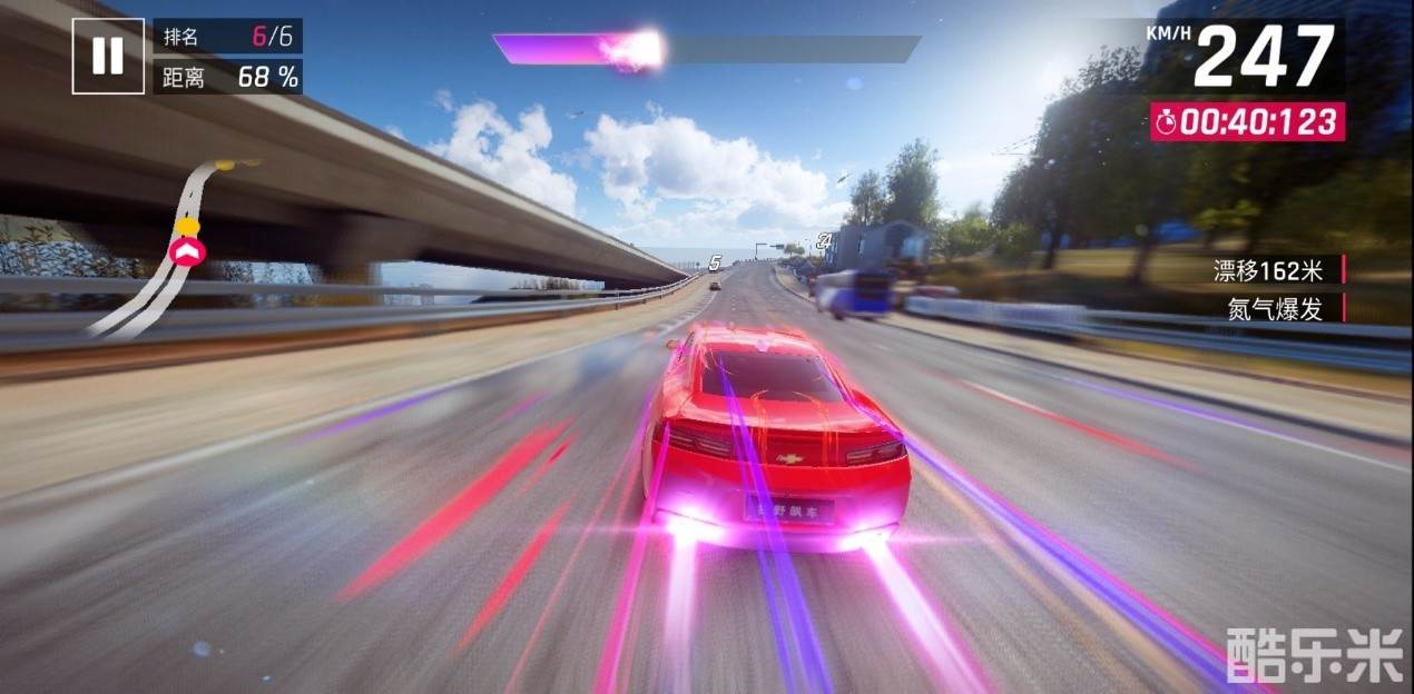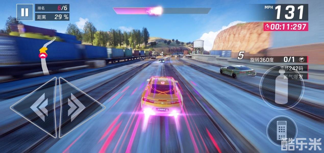 如果想要体验更真实的漂移和转向效果,当然不能错过重力感应模式。重力感应模式操作与智能驾驶一样,触摸左边屏幕漂移,触摸右边激活氮气,不过转向就变成了倾斜屏幕来控制。