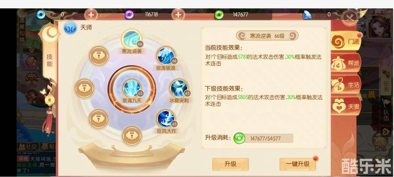 一技能【寒流逆袭:对1个目标造成法术攻击伤害,30%的概率触发法术连击】非常高伤害的单体输出技能,更重要的是法术连击的加成。一般情况下,如果触发了法术连击是可以直接带走一只小怪的。虽然比不上天策三连击的输出总和,但是一样当仁不让。