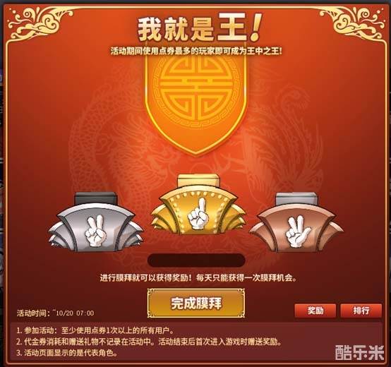 活动规则:活动期间使用点券最多的玩家成为王中之王!活动期间使用点券至少1次以上。代金券消费不计算在本活动中。赠送礼物的消费不计入我是王活动。活动结束后,前二十名可获得王者限定角色:王者版瑞尔&佩伊。(活动结束后首次进入游戏发放)