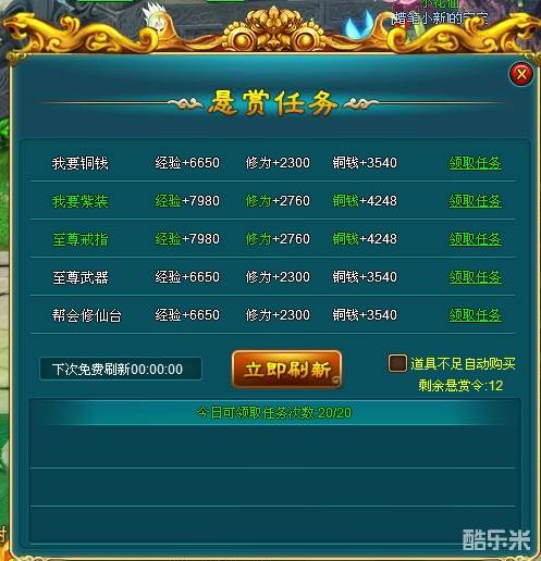 仙友同时只能接受1个悬赏任务,每天可完成20次悬赏任务