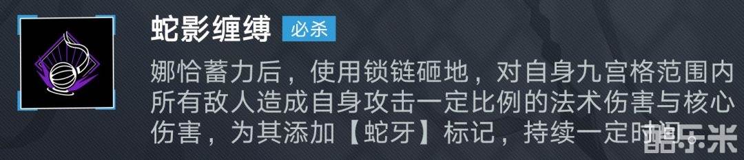这个技能可以造成九宫格范围内的法术伤害和核心伤害,初步判断核心伤害为1点,另外这个技能还可以为受到攻击的敌人施加【蛇牙】标记,后续有这个标记的敌人也会受到娜恰更高的输出伤害。所以作为一位诡秘职业的禁闭者,娜恰的九宫格破核范围还是非常实用的,这点大家可以参考过去的nox、帕伽茜等角色,而如果,只是假设如果娜恰的破核伤害为2点......那么她的这个技能就可以被称为神技了,不过后续我们也还得关注这个技能的cd等设定才能综合判定其强度。