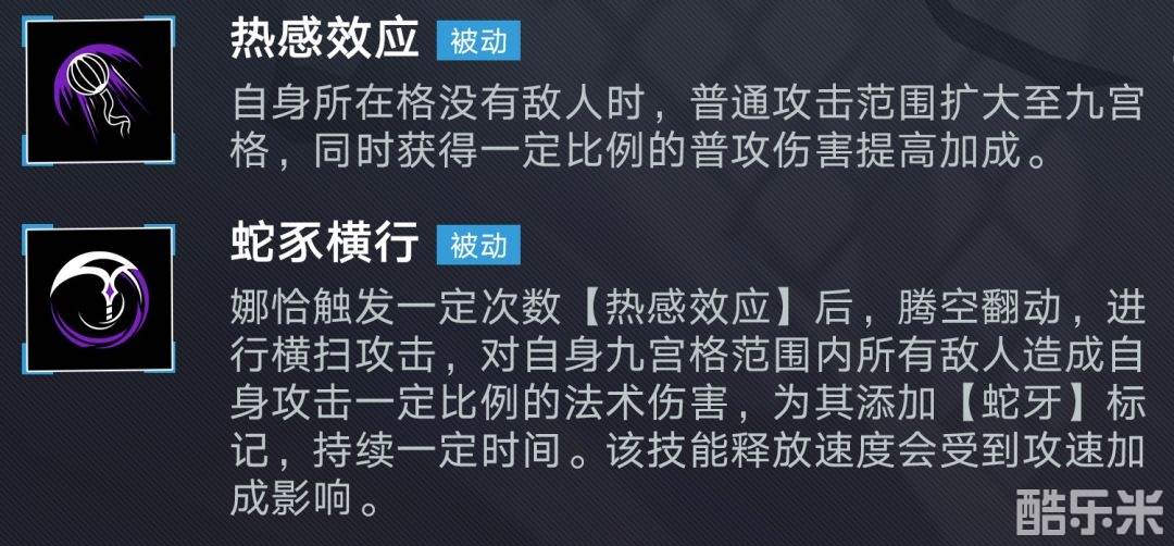 最后娜恰的4技能被动规定在触发了一定次数的3技能被动群攻效果后,娜恰可以对九宫格范围内的所有敌人造成一次额外的范围法术攻击,并且为其添加【蛇牙】标记,且此技能的释放速度还会受到攻速提升的影响,这个被动也一定程度再次提升了娜恰的输出能力,并且考虑到aoe输出的特点,在不少怪海关卡中应该会有较强的作用,例如在上次砂海副本中的sp3关卡中,娜恰这个特性就非常的合适!