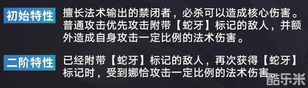 最后娜恰的基础特性是很多法术输出角色的共通类型,不过针对带有【蛇牙】标记的敌人会优先攻击与造成额外伤害的特点也是再次提升了娜恰的输出能力,效果相信还是挺有预期的。