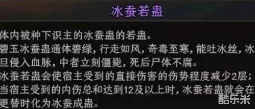 冰蚕蛊:内伤12以上时蜕变为成蛊。