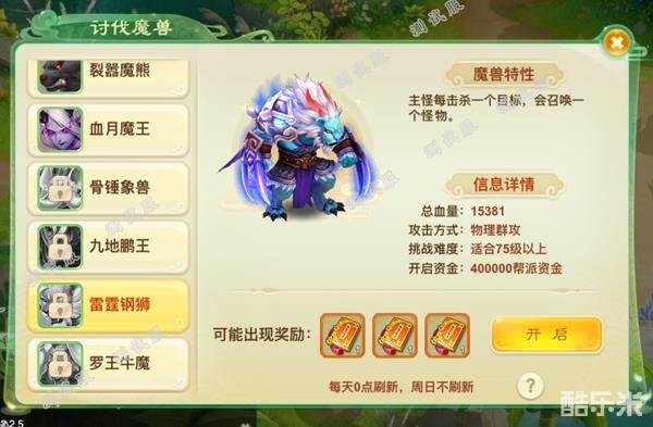 帮主或副帮主可根据帮派实力开启相应等级的魔兽。与帮派竞赛等传统的玩家组队对抗不同,“讨伐魔兽”是单人参与的帮派活动,因而个人实力和伙伴的上阵搭配尤为重要。同时,系统将会对玩家的伤害进行排名,排名靠前的玩家将获得丰厚的帮贡、铜钱奖励。