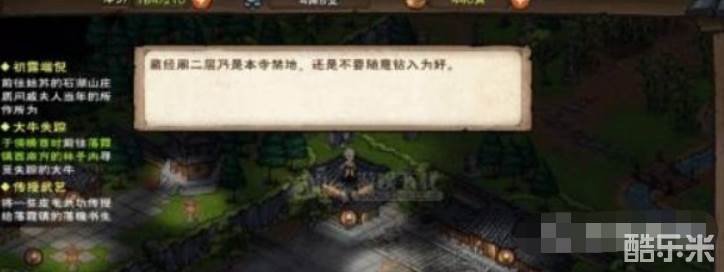 2、需要先把时间切换到子时,前往嵩山场景。利用轻功来到藏经阁顶,点击钻入到藏金阁二层,选中某个书架进行摸索,成功偷取到秘籍残页。