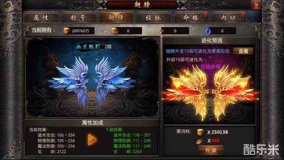 时刻浮现在人物身后的华丽羽翼,随着玩家的培养可以改变外观,不仅炫彩夺目,还可以带来强力的属性提升!要想翅膀给人物提升更高的属性,需要消耗金币和材料羽毛提升翅膀等级,每提升一定等级还可以消耗道具圣水来进行进阶。