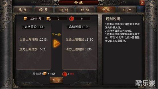 命格功能可以提升玩家的红蓝上限,等级越高,上限越高,从而大大提升玩家的战斗续航能力。命格功能共100级,消耗金币与材料强者之血便可以进行等级提升。