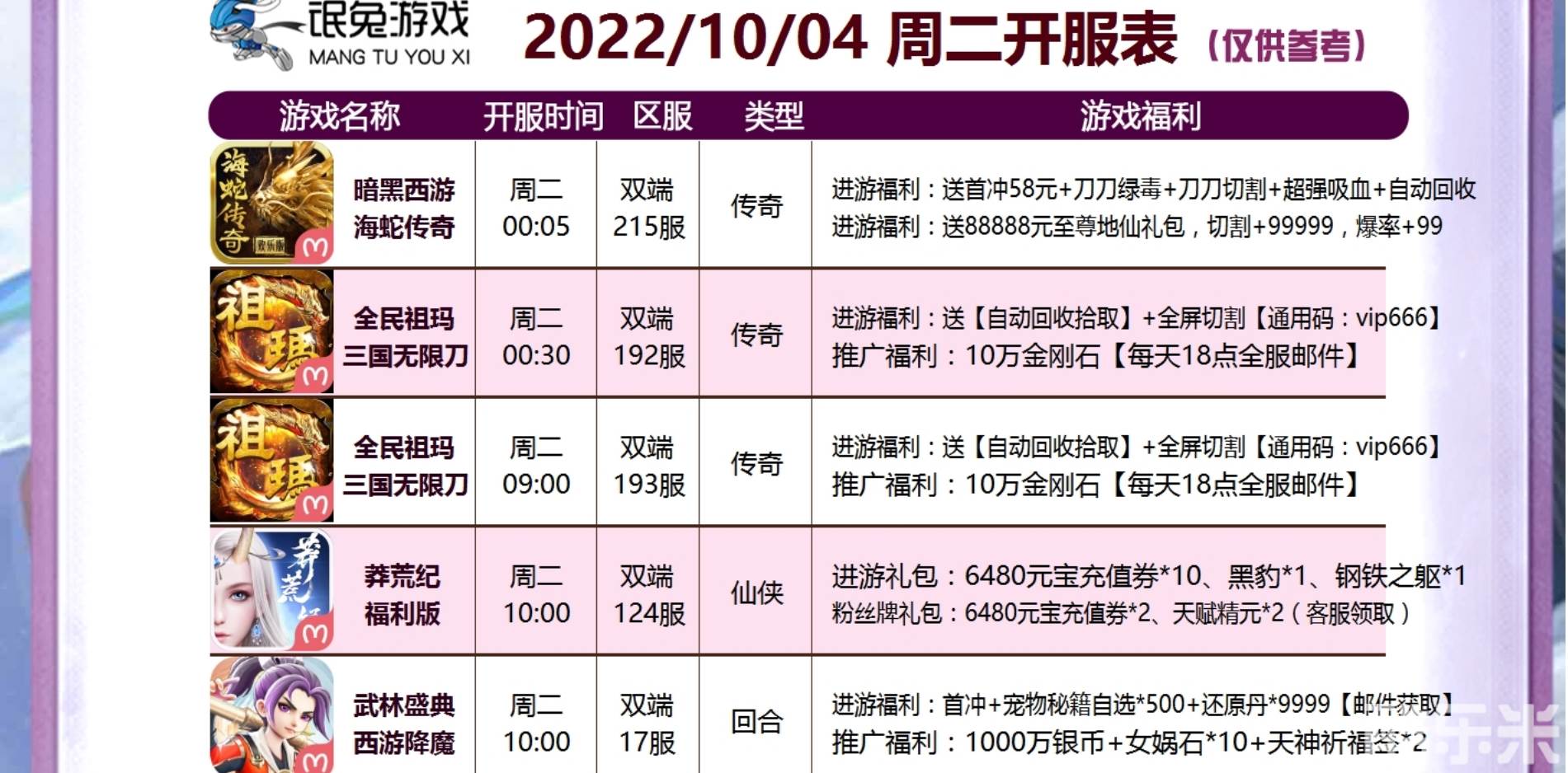 | 莽荒纪-福利版 | 124区( 苹果- 安卓) | 2022-10-04 10:00:00 |