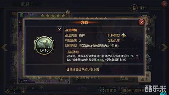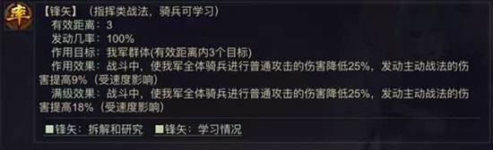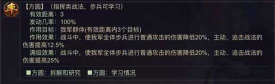 相信这个技能大家应该很熟悉了吧,在减少一定的普通攻击伤害的代价下,依照所带武将的速度属性给予全军主动技能的一个伤害提升效果。因为他给予的主动技能伤害提升是按照所带技能武将的速度属性来加成的。