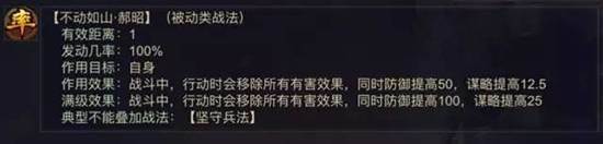 战斗中通过牺牲普通攻击的伤害来得到主动以及追击战法的伤害提升。具体为通过牺牲20%的普通攻击伤害来提升主动战法以及追击战法伤害16.8%(受防御属性影响),现在这个战法改版后会受到防御属性影响。