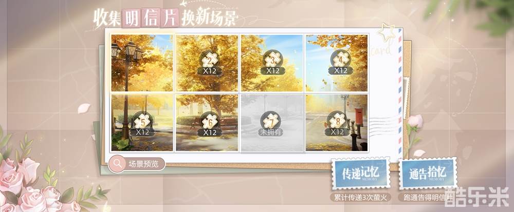 金秋十月,怎么少得了对应的美景,《绝对演绎》也为玩家带来了金秋专属主界面场景皮肤。一片黄澄澄的树林,树叶纷纷扬扬落在地上,和煦暖人的阳光笼罩住整片大地,如此精美的场景当然是免费得到的啦!10月1日开始,玩家可以从通告中获得一定数量的明信片,用于解锁“秋日公园”新场景。