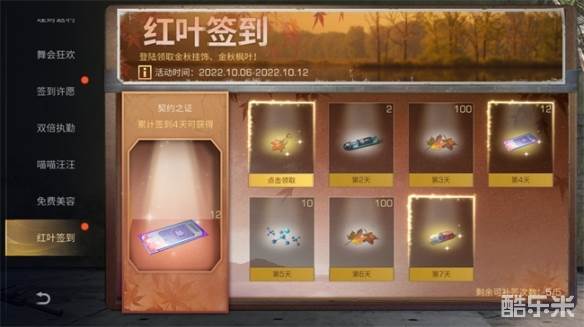 10月6日-10月12日期间,每日登录可获得一次领取奖励机会,累计签到特定天数可获得一叶知秋挂饰、金秋枫叶、契约之证、基因胶囊等丰厚奖励。
