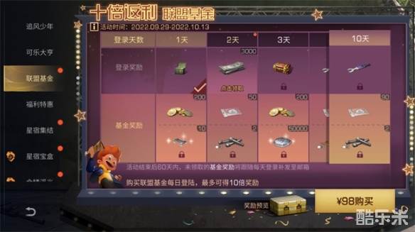 即日起到10月13日,活动期间只需每日登录游戏,即可免费获得联盟送出的丰厚登录奖励,购买联盟基金后每日登录游戏,还可额外获得2100信用点返还、13万技能点、配方残页、记忆材料、机械材料等高性价比奖励,最多可得10倍奖励!