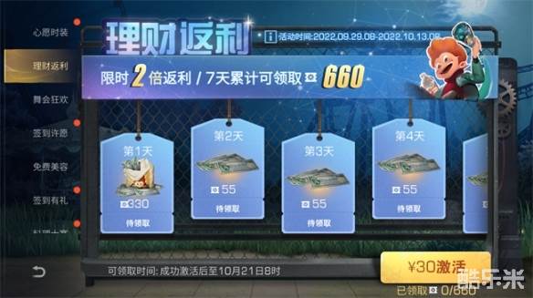 限时2倍返利!即日至10月13日8点,激活理财返利活动,成功激活后可领取时间至10月21日8点,每天登录均可领取支票,7天累计可领660支票!