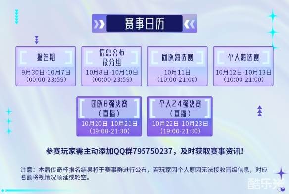 快手传奇杯秋季赛分为个人赛与团队赛两大赛道,9月30日-10月7日期间,所有达到赛道精英段位以上的玩家(需满足真实年龄区间18-50岁),皆可通过游戏内邮地址或赛事专题页,前往网易BATTLE平台进行报名。参赛选手允许同时报名个人赛与团队赛,但每位选手只能属于一只队伍且仅代表该队伍参赛;每个俱乐部参赛队伍数量至多为2支,且每支队伍至多可带一位替补。报名结束后,10月8日-10日,报名结果及分组情况将进行正式公布,参赛玩家可于赛事群中及时获取资讯。