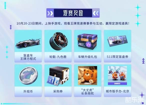快手传奇杯秋季赛期间,热爱竞速的小伙伴们可在快手搜索王牌竞速手游,一键直达直播间观看精彩赛事。参与直播间中的赛事互动活动,还能赢取S11盲盒车-王牌方程式、限定轮毂-九色鹿等限定游戏道具和“大丈虎”长条抱枕等实物奖励,赛里赛外都可收获满满!