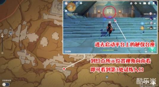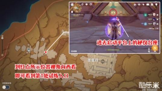 1.来到下图所示位置,往西边看,就可以看到第一处试炼的入口,我们进去到中央的平台上启动秘仪台座即可。