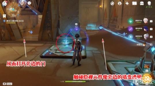 5.两个机关全部复原后,我们触碰门旁边的这个隐视机关,旁边的墙壁就会变成透明形态,使光束导通,这样门就会打开了。