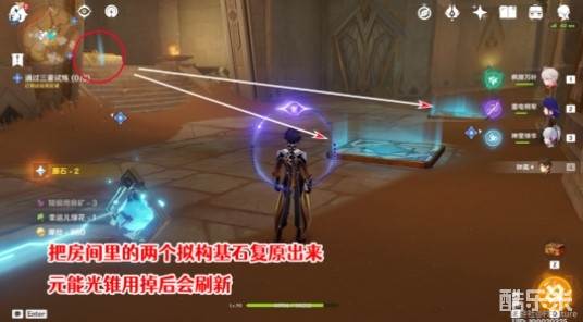 6.从我们打开的门进入下一个房间,拾取房间里的元能光锥,将这里的两个拟构基石全部复原。(元能光锥用掉后等一会会刷新,也可以去拿前一个屋子里已经刷新出来的过来)