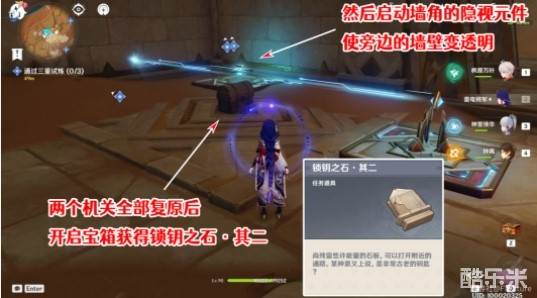 14.现在两个机关就全部复原了,我们开启这里的普通箱,拿到「锁钥之石·其二」,然后启动墙角刚才复原出来的隐视元件,使墙壁变透明,最后再回到之前刚下来的、有风场的那个房间。