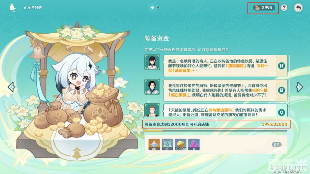 筹备资金达到3.2w摩拉,即可开店!筹备资金下面可以看到有4个任务,分别是2个代购和2个采购。代购是可以中间商赚差价的。点击即可获得任务位置。