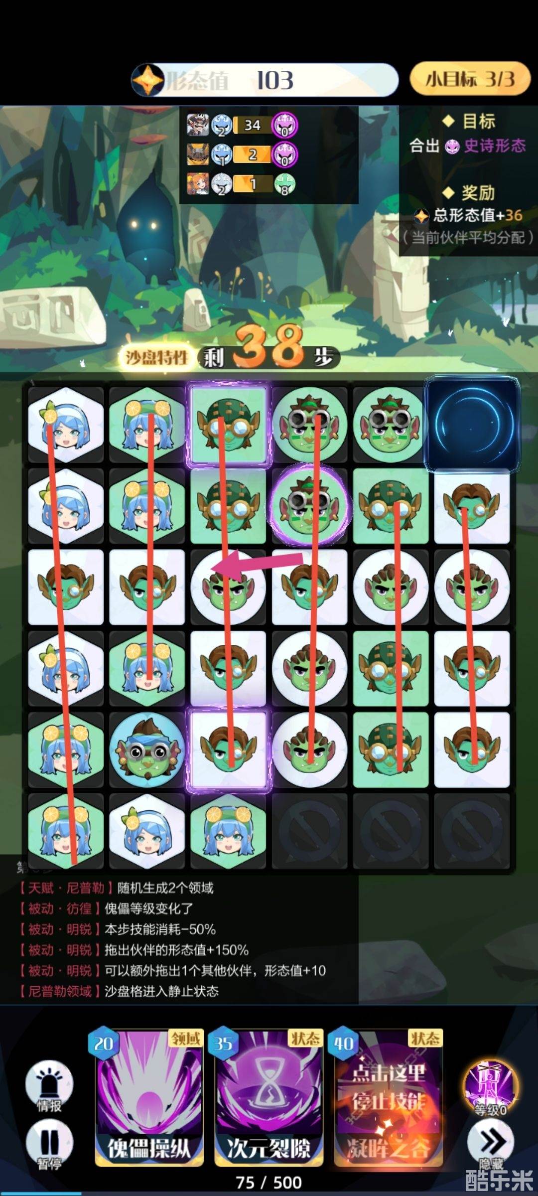 核心是凝眸之谷,先在右上角用傀儡操纵,拖出来触发静止状态,就算右上角有领域也要用傀儡操纵,目的是第二个技能能量消耗减少,由于这个沙盘合成紫色能量加50,非常适合这个英雄,就是费时间,估计半个小时。