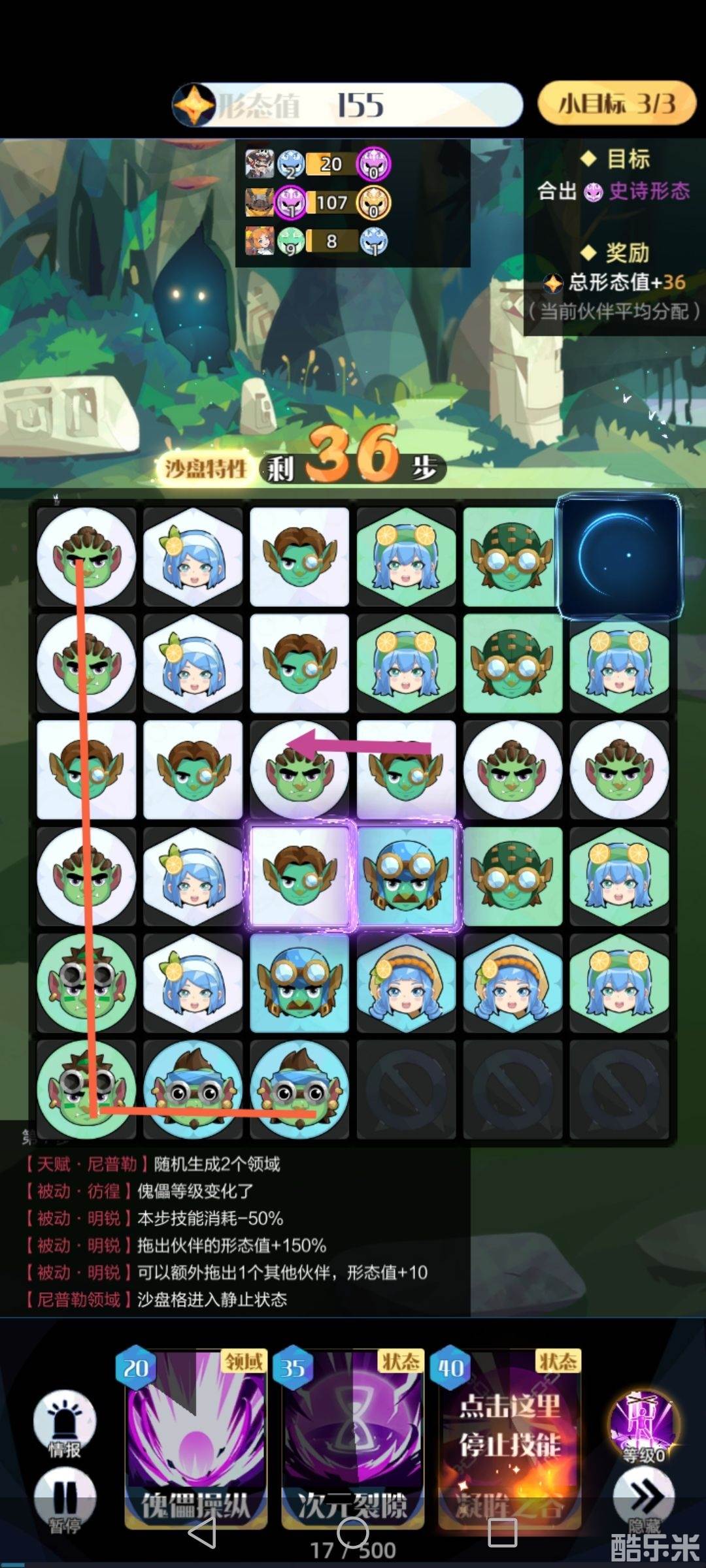 过关没截图,这是消除变强,慢慢操作每一个都可以弄出橙色,最后10步要注意了,留有足够能量把橙色加上领域,然后用技能次元裂缝把橙色拖出来,在领域中拖出有形态加成,我是2200W战力轻松过的。