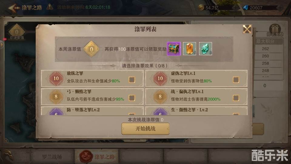 对战斗力自信的玩家可以一次性勾选全部涤罪效果来获得所有的涤罪值,当然我们大部分玩家可以不断的尝试属于自己的通关方法,获得最大的涤罪分值!
