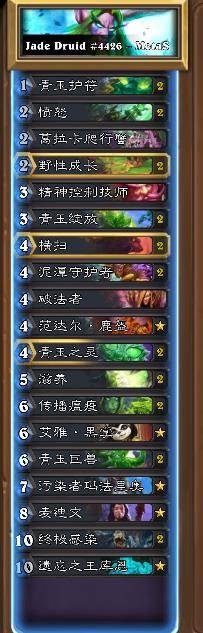 失去了激活,青玉德变成了纯粹的科技铺场卡组,而增加一费的传播瘟疫似乎对这张卡的强度并没有太多的影响。个人感觉这套牌比之前的青玉德更加无脑和自闭,可能是因为牧师和王子撅起的原因吧,说实话,对于从加基森版本没怎么碰过青玉德的人来说,用这套牌上传说是有点可悲的。这也是现阶段炉石传说给玩家带来的困境,太多的随机性带来的滚雪球(王子系列、牧师58),使得脸黑如我的玩家不得不使用一个稍微扎实一点的滚雪球卡组才能得以生存。