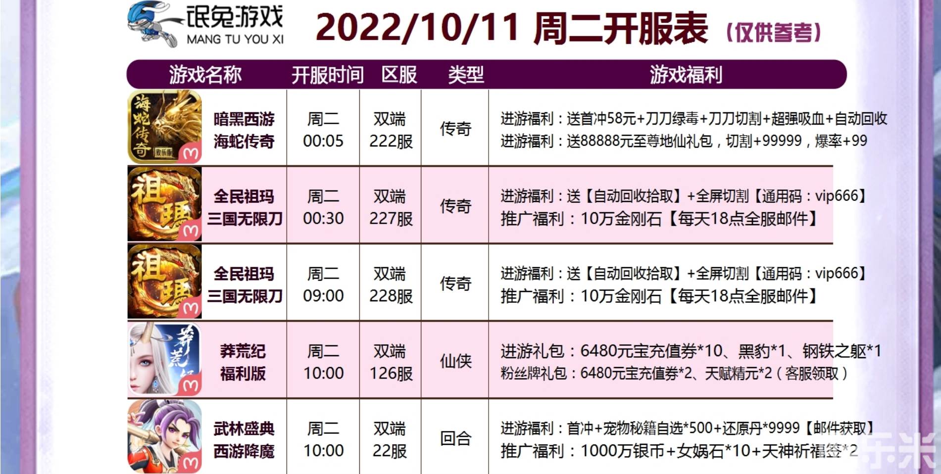 | 莽荒纪-福利版 | 126区( 苹果- 安卓) | 2022-10-11 10:00:00 |