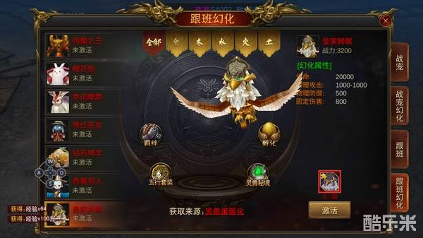 当主线任务完成11个的时候,可激活跟班系统,跟班为战宠的辅助系统。可以激活自动拾取、拓展50个背包、双倍拾取等特权!