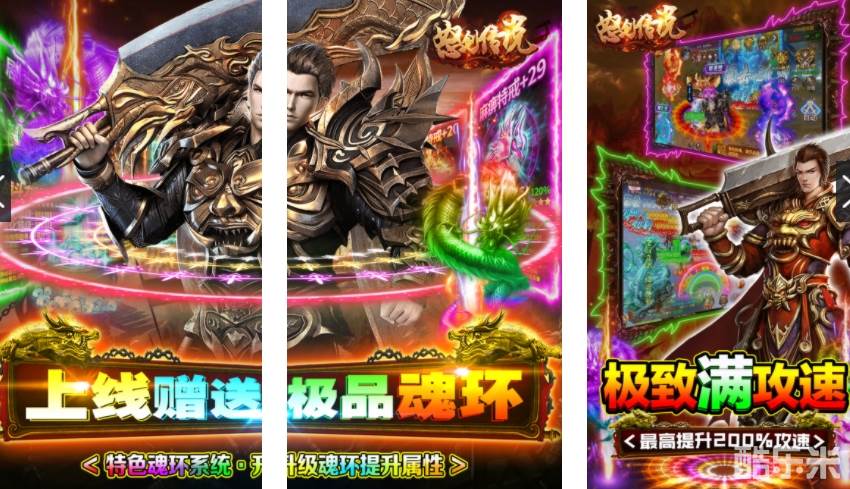 上线送满V,充值比例1:1000,送100W钻石 【怒剑传说】:上线送满级VIP、100W钻石、十年魂环、称号“刀刀爆充值”、限定体验时装。特色魂环系统,升级魂环还可提升对应属性。上线极致攻速体验,最高可提升200%攻速。激情PK,自由交易,在线回收,装备全靠打,小怪爆终极。