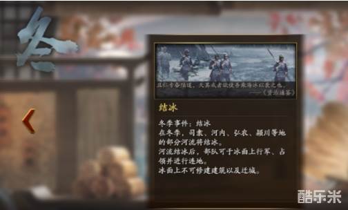 注意冬季可以结冰的河面只有一格宽的冰面,大河是没法结冰的,所以迁城的时候要注意避免在小河边落城,否则冬季结冰之后,这里将直接成为战场。