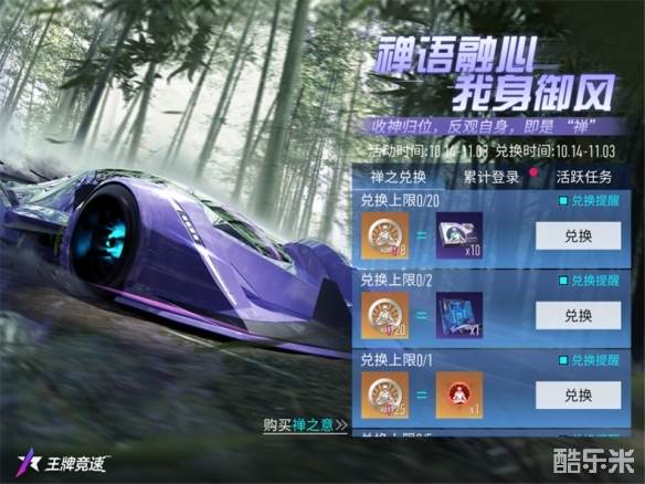 为了让车手们更快地完成车辆进阶,王牌速度节将同步开启专属活动,车手们完成累计登录和活跃任务就能获得“禅之意”徽章,可用于兑换车辆进阶所需的各类资源,禅之意徽章也可使用礼品点直接购买。车手们还可以参与禅心之约活动,选取心仪奖励开启挑战,将有机会获得禅、禅-阿努比斯涂装或禅蓝图!