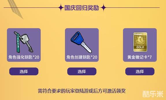 仅限8月15日-9月20日未登录过游戏的玩家领取,需在10月1日-10月7日内登陆游戏后,激活回归奖励,即可选择其1款心仪的奖励领取领取,奖励为3选1,每个账号仅限领取1次。