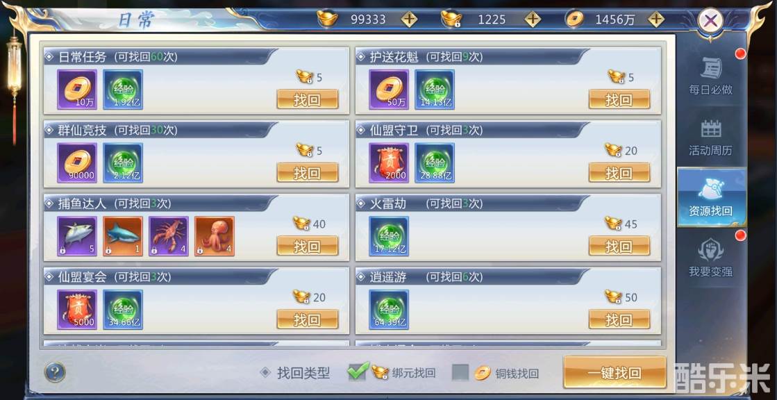 ★铜钱找回只能找回绑玉找回的80%奖励