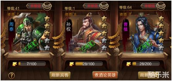 开启特权卡,每天可以免费刷新3次,刷到神将或主力将领或没激活的武将可以适当用元宝宴请几次,系统每隔2天送的免费宴请次数不要轻易用,利用每天免费的刷新次数刷到最需要的将再去用,只刷到1个或2个中意的可以先锁定,第二天再用免费次数刷。