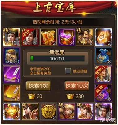 宝库280元宝一次10连,很实惠,小R中R有条件的可以把12星的武将刷出来。也有运气好的玩家一下抽出了12星的武将哦,可以试试,碰碰运气。