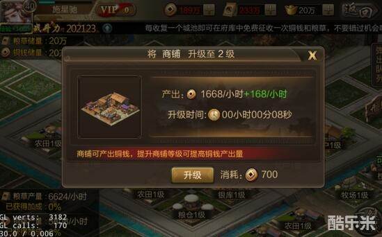 11级之后玩家将免费获得一块封地,在封地中可以建造各类建筑,其中民居与商铺可以自动产出铜钱。升级民居与商铺之后,铜钱产出量会变得更多,投资才会有回报,所以千万不要吝啬升级建筑的那一点点钱哦!