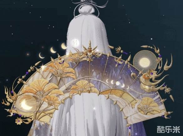 以月下幽谷为灵感设计的背挂·花筵盛世样式华美,色彩绚烂。扇面好似一卷画幅,将那无垠月色下幽静山谷的神秘景致展现在大家面前,星河烂漫,连绵的山峰层叠不穷,雄伟壮阔。