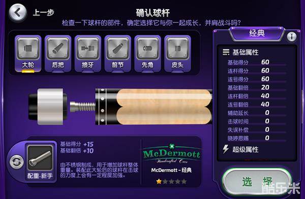 没错,第一支球杆的名字就叫做经典,外形和分数都比较中规中矩。位于第一选择位的球杆,可能会成为一些还没摸清状况就进入游戏的玩家的首个选择。从数据上看, McDermott经典的加分属性都很高,仅仅获得翻倍的概率偏低。适合喜欢稳扎稳打不爱拼脸的选手使用,很适合新手玩家。