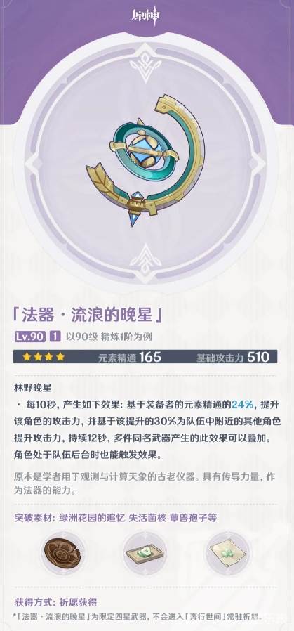 「法器-流浪的晚星」为限定四星武器,不会进入「奔行世间J常驻祈愿。