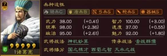 此外,超高的智力、统率,也是诸葛亮能稳坐主将位的一大依仗。唯一短板,就是速度太慢,属于短腿法师,所以我们搭配战法的时候需要考虑这一点。
