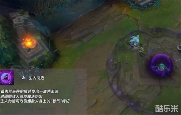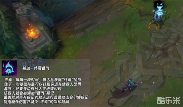 只要身边有敌人突进或闪现,该敌人就会被添加“暮气”标记。薇古丝对带有标记的敌人进行普通攻击会引爆标记,制造额外伤害并减少“终焉”的冷却时间。