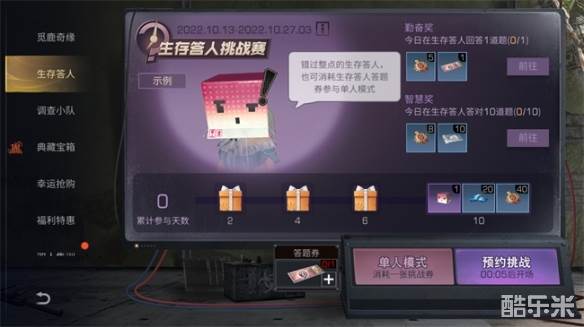 10月13日至10月26日期间,每天9-23点的整点时刻,幸存者们可踊跃参与“生存答人”活动。活动期间,幸存者可以额外领取每日奖励、累积奖励,同时商队集市、每日奖励新增生存答人答题券,消耗答题券可在任意时间参与生存答人单人挑战。动用丰富的知识储备,看看谁才是废土中的生存达人!
