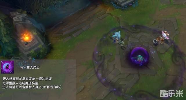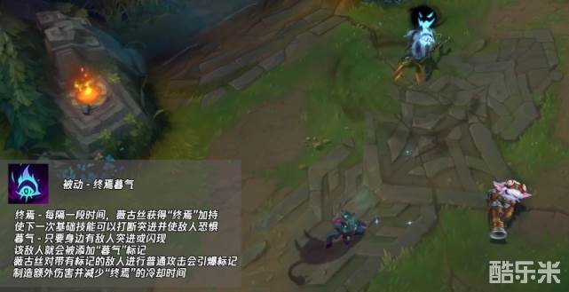暮气 - 只要身边有敌人突进或闪现,该敌人就会被添加“暮气”标记。薇古丝对带有标记的敌人进行普通攻击会引爆标记,制造额外伤害并减少“终焉”的冷却时间。